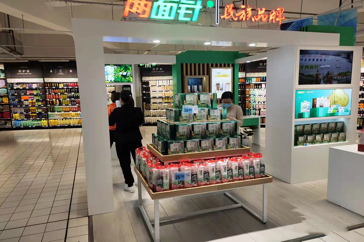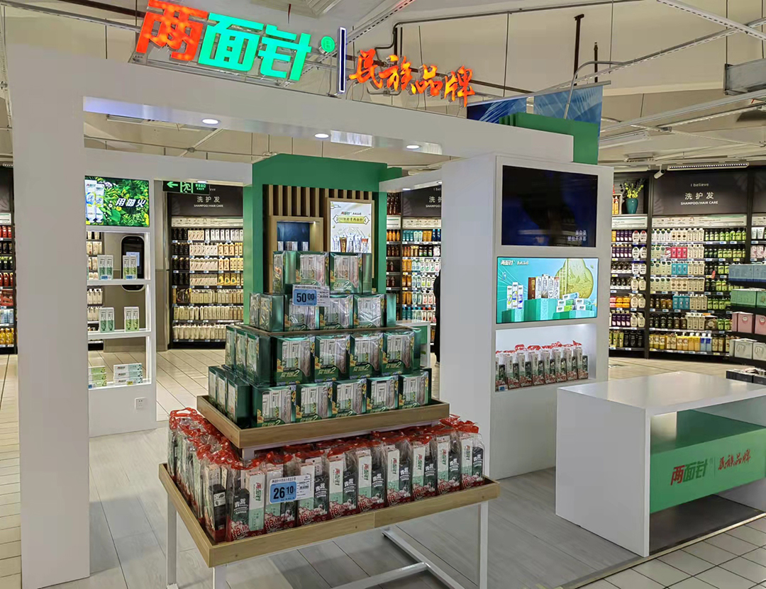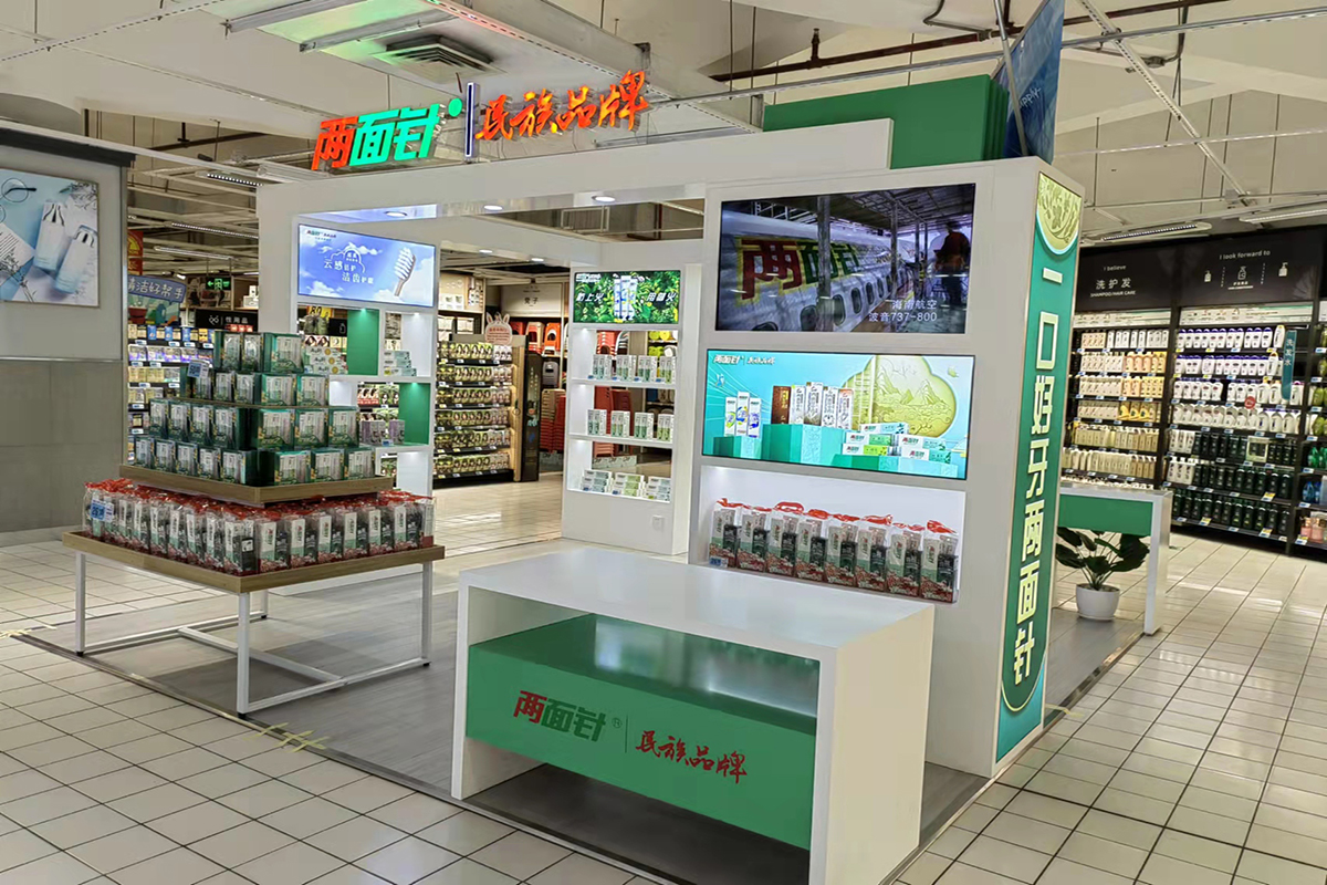 兩面針SIS位于大潤發(fā)主要銷售通道中,整體設(shè)計打破了傳統(tǒng)柜臺銷售理念,秉承“傳承、健康、時尚”的品牌理念,以2021年東盟博覽會兩面針展館設(shè)計為原型,在時尚的潮流中打造出一片專屬兩面針品牌的藝術(shù)空間,成了整個大潤發(fā)里一道靚麗的風(fēng)景線。開業(yè)當(dāng)天便吸引了眾多消費(fèi)者的圍觀。