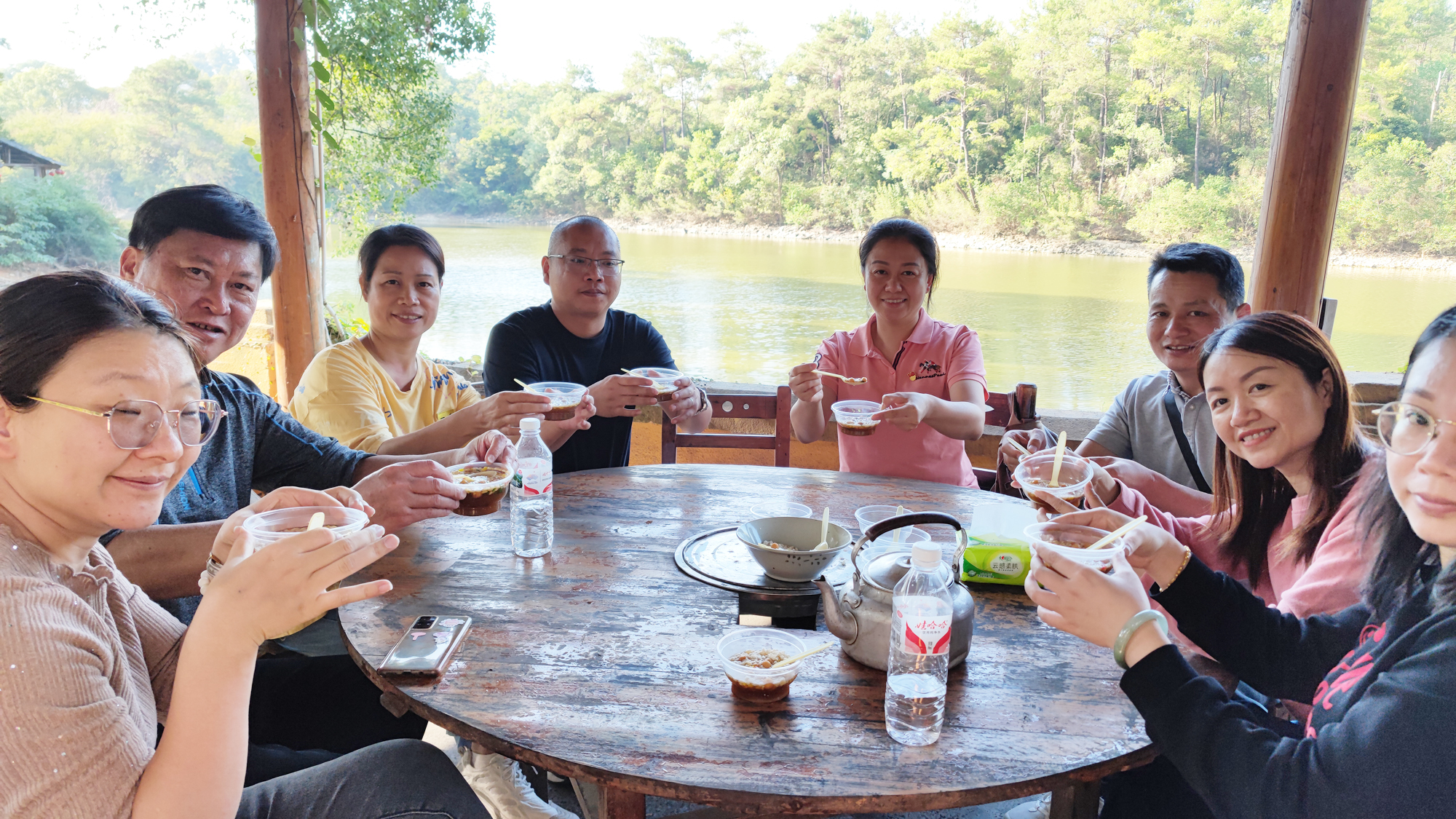 如果說上午的游戲是體力和腦力的結(jié)合,午間的扎染是對傳統(tǒng)文化的傳承和提高美的鑒賞力,那么午后的“下午茶”則是一場傳統(tǒng)飲食文化的“盛宴”。不少青年職工都是第一次見到并動手舂糍粑,民俗的傳承在大家歡聲笑語中留下了印記,品嘗著一個個有嚼勁的糍粑,搭配一碗碗傳統(tǒng)美食油茶,自己動手的味道就是香啊!