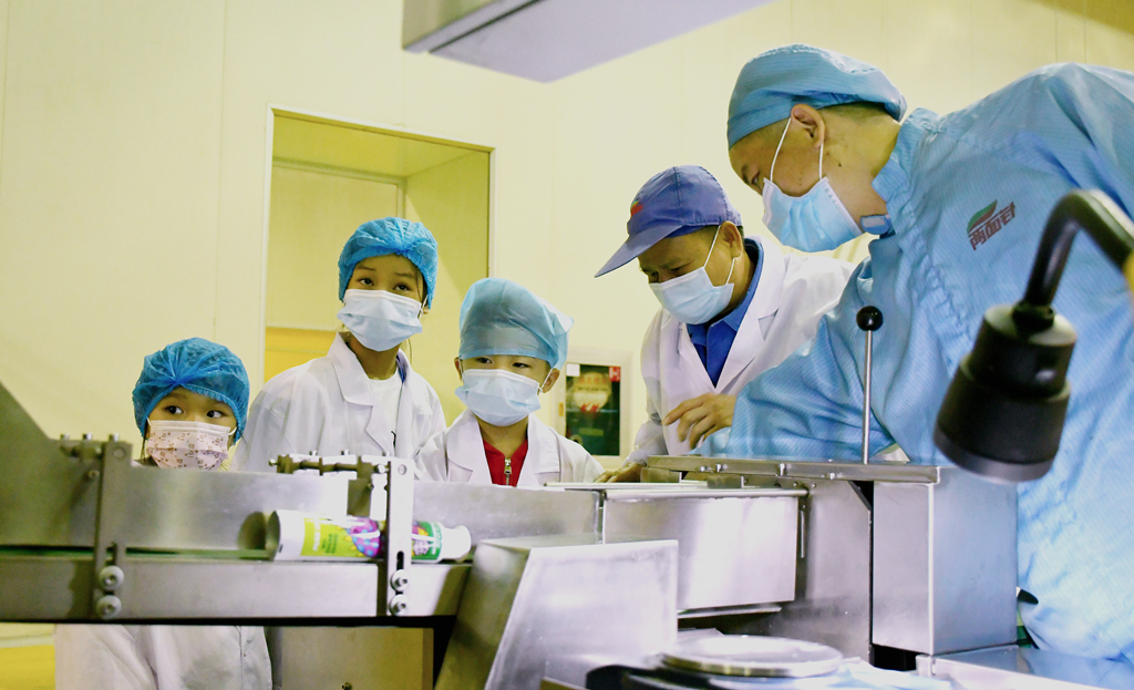 公司首席研發官、輕工大國工匠、教授級高級工程師黃光偉帶領大家參觀兩面針牙膏生產線,介紹牙膏的投料、制膏、灌裝、包裝等生產流程。“我們的牙膏生產線處于封閉狀態,自動化作業程度非常高,大家可以聽到機器運轉的聲音,但現場看不到太多的工人。”黃光偉講得很仔細。小記者們聽得很認真,還不斷向黃老師請教問題。